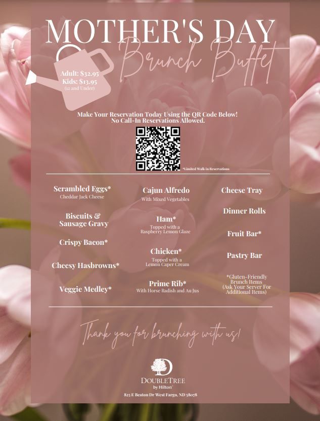 Mothers Day Brunch DoubleTree by Hilton West Fargo May 14, 2023, Reservations are now being accepted and are required to attend.